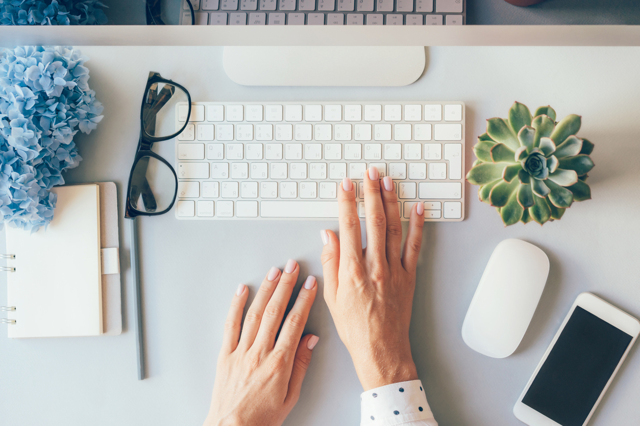 Top view on female elegant hands on a computer keyboard. Businesswoman in the office.